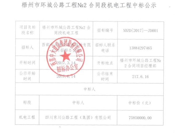 Project Awarding Notice, Electromechanical Work of Wuzhou Ringroad Project