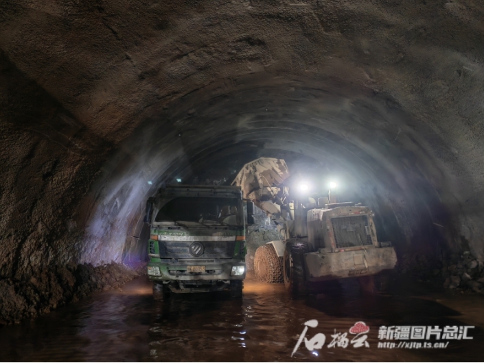 艾肯隧道内,施工人员在装运废渣。石榴云/新疆日报记者 逯风暴摄