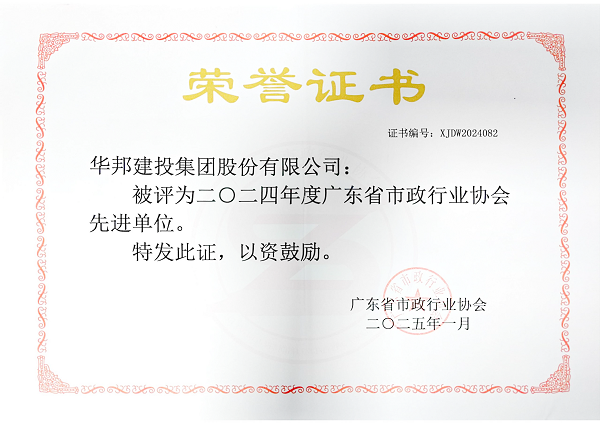 近日,经广东省市政行业协会评审,华体会在线登录官网-华体会online(中国) 荣获2024年度“广东省市政行业协会先进单位”荣誉。本次获评是对华体会在线登录官网-华体会online(中国) 建设能力、诚实经营、规范管理等综合实力的肯定。