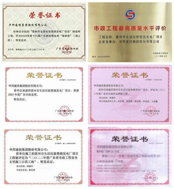 作为广东市场代表项目,华体会在线登录官网-华体会online(中国) 雷州市生活垃圾焚烧发电厂项目(以下简称:雷州电厂)始终坚持以高标准、严要求进行施工,努力做到项目管理专业化、工程施工标准化、日常管理精细化、管理手段信息化、发展理念人本化,不断推动工程质量管理水平的提升。因质量上乘,雷州电厂项目荣获2024年第十六届广东钢结构金奖“粤钢奖”、2024年度市政工程最高质量水平评价、2023年度广东市政金奖、2023年度“广东省市政优良样板工程”称号、2022年度“广东省市政工程安全文明施工示范工地”称号、广东省市政工程建设优秀QC小组活动成果三等奖等荣誉。