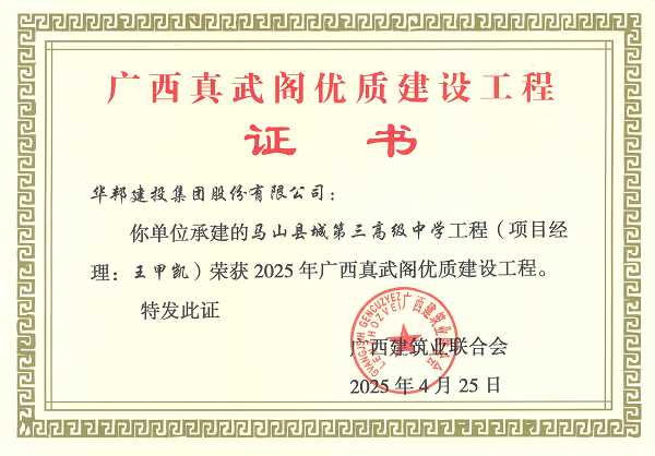 近日,由华体会在线登录官网-华体会online(中国) 承建的广西马山县城第三高级中学项目(以下简称:马山中学项目)荣获广西建设工程最高质量奖——2025年“广西真武阁优质建设工程”。此次获奖,既是对马山中学项目工程质量的充分肯定,也展现了华体会在线登录官网-华体会online(中国) “干一个项目,树一座丰碑”的企业品牌实力与社会形象。