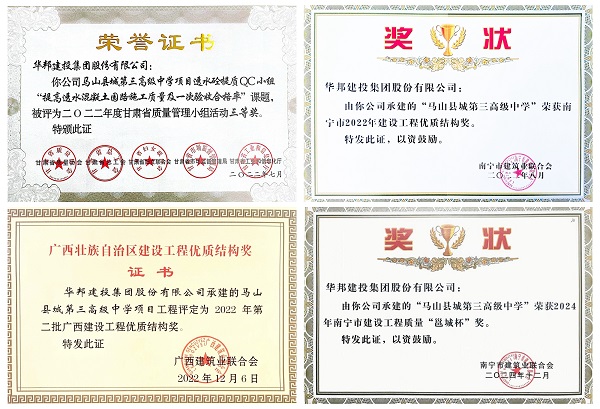 在项目建设过程中,华体会在线登录官网-华体会online(中国) 始终坚持“安全第一、质量为本”的理念,大力推行安全文明施工和精细化管理,积极应用新技术、新工艺、新设备,全面提升工程质量和安全水平。马山中学项目还荣获“2022年度甘肃省质量管理小组活动三等奖”“2022年第二批广西建设工程优质结构奖”“南宁市2022年建设工程优质结构奖”“2024年南宁市建设工程质量‘邕城杯'奖”等多项荣誉。