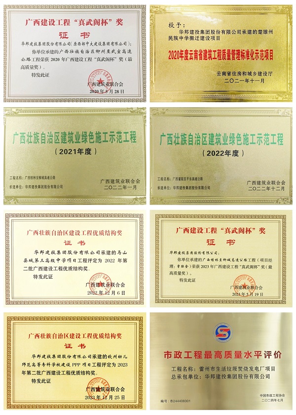 以“施工精细、技术精妙、管理精心、工艺精湛、精益求精”为目标,致力于创建品质工程。多个项目获省市级表彰,其中,广西柳州至武宣高速公路、桂林至柳城高速公路均获广西建设工程“真武阁杯”奖(广西工程质量最高奖)、广西桂林至柳城高速公路及广西灌阳至平乐高速公路获广西建筑业绿色施工示范工程、广西马山县城第三高级中学项目、钦州幼专学校项目获广西建设工程优质结构奖、甘肃榆中教育园区和榆中医院项目获“甘肃省建设工程文明工地”称号、云南楚雄民族中学搬迁建设项目获云南省华体会在线登录官网-华体会online(中国)质量管理标准化示范项目、广东雷州电厂项目通过“2024年度市政工程最高质量水平评价”……
