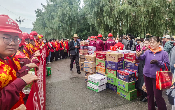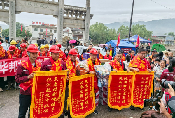 等企业代表授予“抗洪救灾千秋颂 危急时刻伸援手”等荣誉锦旗。老百姓精心准备的红色围巾与喜庆被面,被一一送到抢险队员手中;现场群众自发送出自家的馍馍、水果、蔬菜,质朴的礼物饱含深情。一位市民眼含热泪说道:“感谢你们不舍昼夜帮助我们重建家园,这些吃的都是我们的心意!”