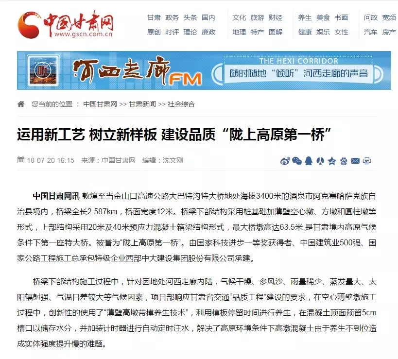 近日,由集团公司承建的敦当高速公路试验一标大巴沟特大桥工程创新工艺施工受到省内媒体的关注,中国甘肃网撰文报道了题为《运用新工艺 树立新样板 建设品质“陇上高原第一桥”》相关信息。