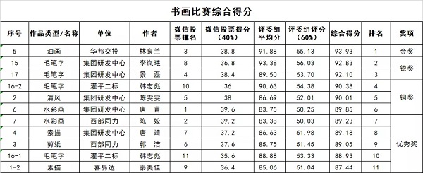 为庆祝新中国成立70周年,扎实开展“不忘初心、牢记使命”主题教育,进一步激发广大员工的爱国情怀和敬业奉献的精神,集团公司开展了书画比赛,现已落下帷幕。在选手们的努力拉票及评委们对参赛作品的认真审评后,比赛结果出炉啦!