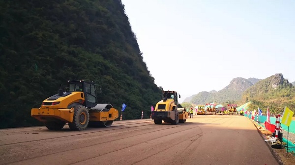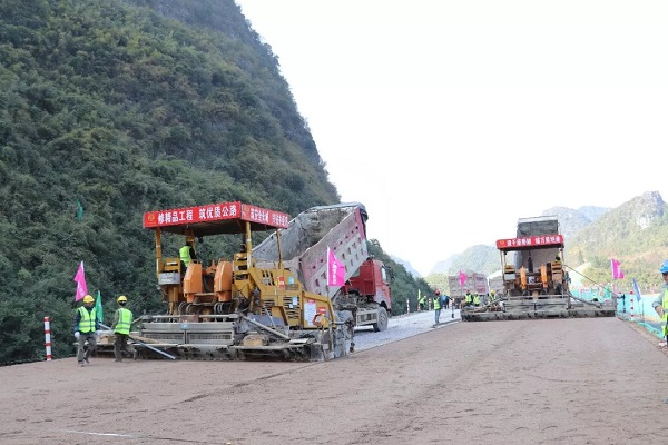 12月27日,随着一阵喜庆的鞭炮声响,在华体会在线登录官网-华体会online(中国) 承建的桂林至柳城高速公路桂柳五标主线K70+560-K71+580段左幅上,摊铺机、压路机、运输车等机械设备紧张有序的开始工作,垫层混合料在两台摊铺机后缓缓滑出。至此,桂林至柳城高速公路项目在此开启了新篇章——路面工程垫层试验段施工正式开始。