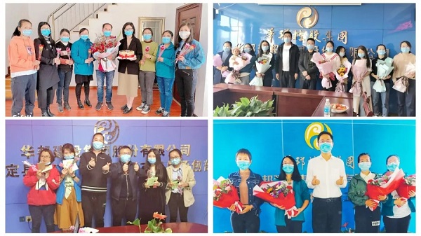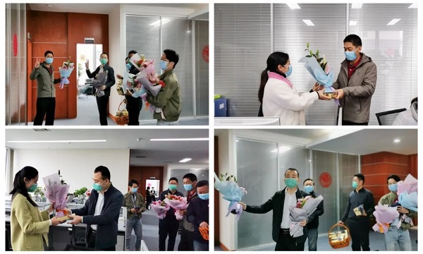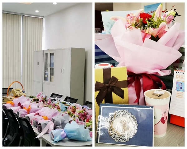 美丽的花束、甜蜜的巧克力、暖暖的下午茶,以及亲手写满祝福的贺卡是公司全体男同事为女同胞们精心准备的礼物。“祝你节日快乐……”午休时间,公司总经理刘之龙率领祝福小分队,将节日祝福一一送到“女神”手中。意外的惊喜让各位女神笑颜逐开,大大的口罩也遮盖不住大家满心的欢喜。疫情阻挡不了温情,口罩隔不开友情。三月,向坚持奋斗在工作一线的所有女神们致敬。