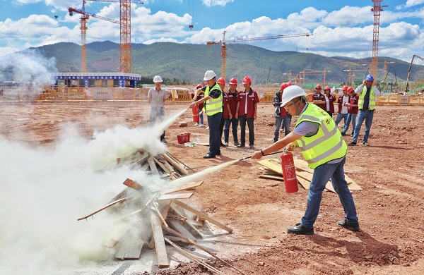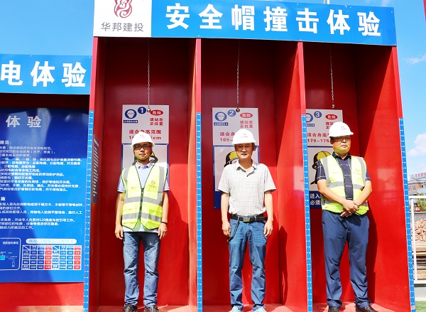 安全教育结束后,李春和工人代表们带队到安全体验区进行安全帽撞击、洞口坠落等体验,让工人们切身感受安全防护措施于施工人员的重要意义;随后全体参会人员现场进行消防安全演练,致力让员工学习到正确的消防安全防护知识,学会使用灭火器,以达到“遇事不慌、积极应对、自我保护”的目的。