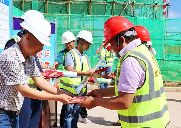 在施工现场,楚雄民中投资公司工程副总经理杨永江对工人代表进行安全教育,并和姚军、李春为工人代表发放安全宣传手册。