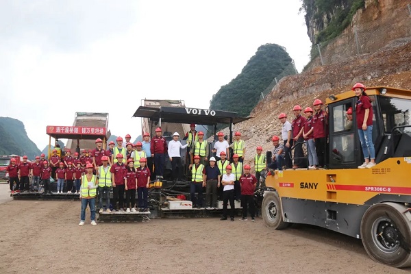 在现场,苏如春登上摊铺机,现场气氛高涨,他指着摊铺机上的标语“造千座隧道,铺万里坦途”说:“这是我08年题写的标语,没想到兄弟们还记得”。随后,他与项目一线施工管理人员和施工人员一起合影留念,高呼“华邦,生日快乐”,共庆华邦成立20周年。