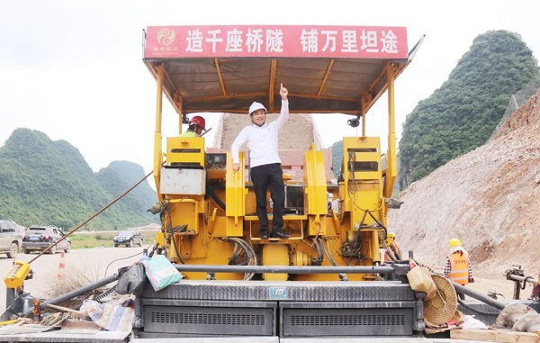 在桂柳路面施工现场,摊铺机、拉料车、压路机、挖机来回穿梭,施工人员正在利用暴雨前晴好天气抢抓施工进度,工地上一片热火朝天的繁忙景象。苏如春来到现场,鼓励大家齐心协力,鼓足干劲,统一思想,坚定目标,确保桂柳项目如期通车。