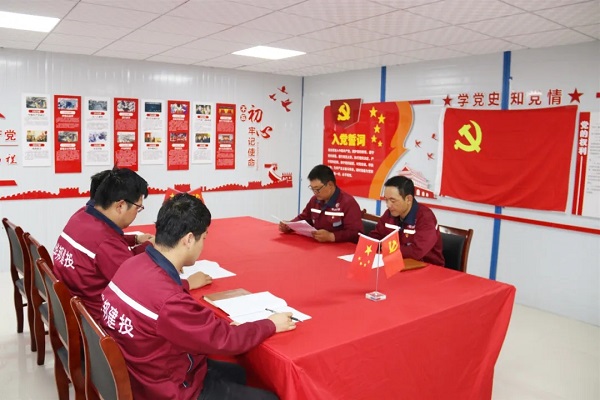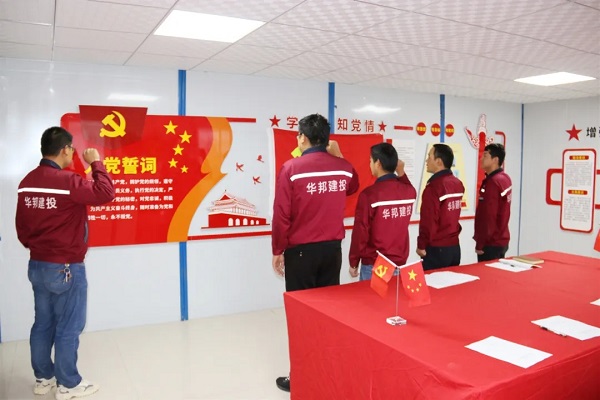 在榆中教育园区项目党建活动室,全体党员面对鲜红的党旗,高举右拳、紧握拳头,重温入党誓词,庄严宣誓:“我志愿加入中国共产党,拥护党的纲领,遵守党的章程……永不叛党”。铿锵的誓词,让在场的每一位党员都得到了精神的洗礼和党性的锤炼。