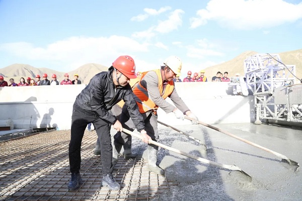 大巴特沟特大桥桥梁全长2587米,桥面宽度12米,最大桥墩高达63.5米,是甘肃境内高原气候条件下第一座特大桥,被誉为“陇上高原第一桥”。当天下午,正逢大巴特沟特大桥右线中段最后一联桥面铺装浇筑作业,苏如春迈步跨入现场,双手扶握泵管平稳有序地开始浇筑混凝土,并与现场施工人员一起,完成了最后一车混凝土的浇筑。在现场高呼胜利的呐喊声中,代表圆满的礼炮声中,华邦建投敦当项目迎来了控制性工程全部完成这一重要时刻。