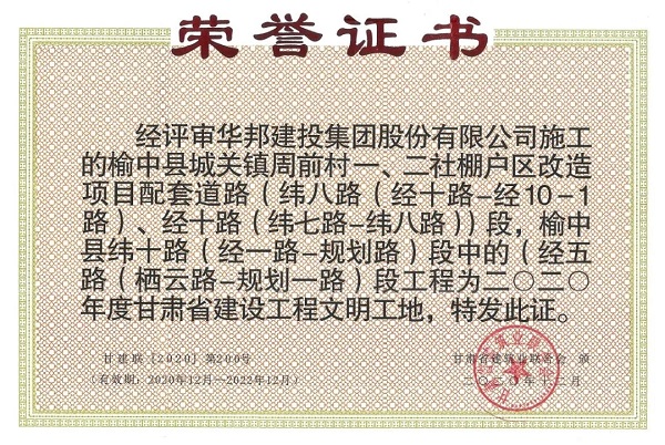 近日,经甘肃省建筑业联合会评审,由华体会在线登录官网-华体会online(中国) 承建的榆中市政项目荣获2020年度甘肃省建设工程文明工地荣誉称号。此次获奖是对华邦建投榆中市政项目合理施工、文明施工的肯定,也是对华体会在线登录官网-华体会online(中国) 建设能力的充分肯定与认可,华邦建投将进一步提升工地安全文明管理水平,展示文明、绿色、智慧工地形象。