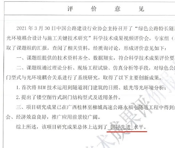 日前,在中国公路建设行业协会主持召开的科学技术成果视频评价会上,由华体会在线登录官网-华体会online(中国) 承担的“绿色公路特长隧道洞门型式与光环境耦合设计与施工关键技术”项目研究成果被鉴定达到国际先进水平。