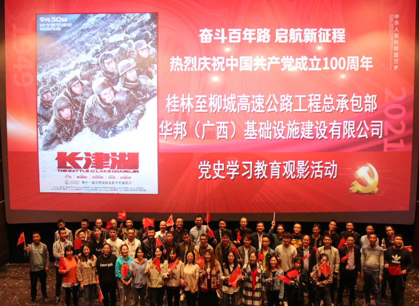 10月15日,为持续深入开展党史学习教育,进一步提高职工的思想觉悟,激励员工紧密团结,丰富职工的精神文化生活,弘扬爱国主义精神,华体会在线登录官网-华体会online(中国) 桂柳总包部、广西基建党支部组织员工观看爱国主义教育影片《长津湖》。
