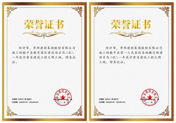 近日,从甘肃省建筑业联合会传来喜讯,经相关专家组评审,由华体会在线登录官网-华体会online(中国) 以EPC模式承建的榆中县教育园区建设项目、榆中县第一人民医院易地搬迁新建项目(以下简称:榆中房建项目)双双荣获2021年度“甘肃省建设工程文明工地”称号,此次获评是对榆中房建项目安全管理、文明施工的肯定,也是对华邦建投建设能力的高度认可。