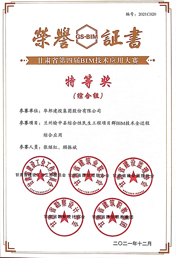 近日,由中国技术创业协会技术创新工作委员会、甘肃省建设工会工作委员会传来喜讯,华体会在线登录官网-华体会online(中国) 参赛项目“兰州榆中县综合性民生工程项目群BIM技术全过程综合应用”荣获第三届“共创杯”智能建造技术创新大赛二等奖、甘肃省第四届BIM技术应用大赛综合组特等奖。两项荣誉的获得,不仅是对华体会在线登录官网-华体会online(中国) 榆中教育园区、榆中医院项目BIM新技术创新应用的肯定,也充分展现了华邦建投智能建造水平。