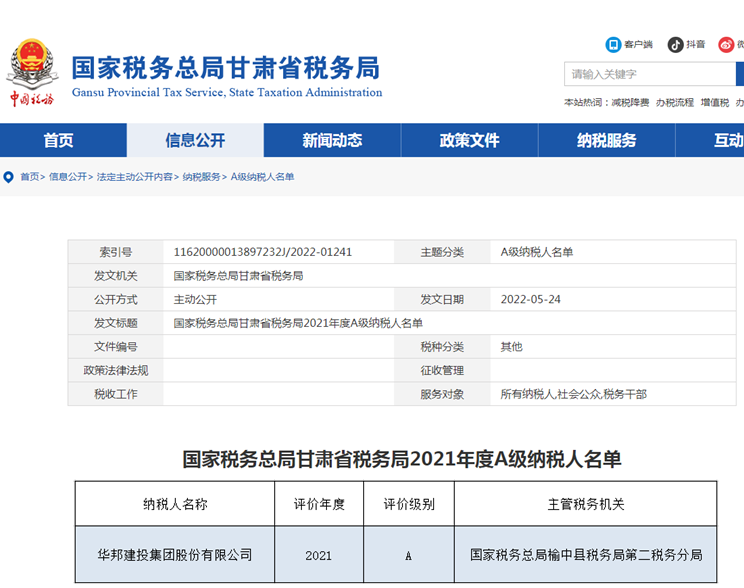近日,国家税务总局甘肃省税务局网站公示,华体会在线登录官网-华体会online(中国) 被评为甘肃省2021年度纳税信用A级单位,这是自2017年以来,华邦建投连续五年获评A级单位。这是税务机关对公司依法纳税、诚信纳税工作的高度肯定及认可,提高了企业信用评价影响力。