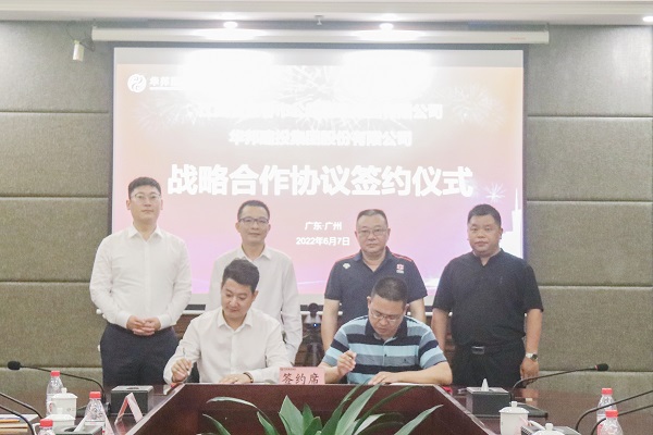 华体会在线登录官网-华体会online(中国) 执行总裁蔡继荣(前排左)与江西宜春公路建设集团副总经理陈斌(前排右)签订战略合作协议