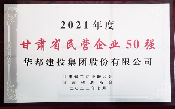 凭借雄厚的综合实力和优异的业绩表现,获评“2021年度甘肃省民营企业50强”。这显示出华邦建投强劲的发展势头,也彰显了社会各界对华邦建投经营能力的高度认可。