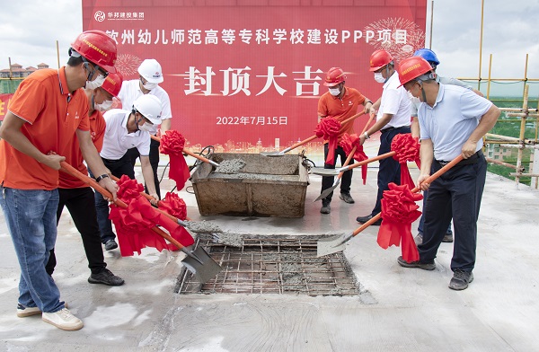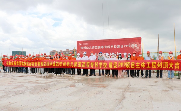 承建的广西钦州幼儿师范高等专科学校建设PPP项目(以下简称:钦州幼专项目)学前初等综合楼、13#和15#宿舍楼主体工程封顶,标志着项目建设取得阶段性成果。钦州幼专学校规划处处长黄传良,华盛育才公司、监理公司及钦州幼专项目等人员参加封顶仪式。