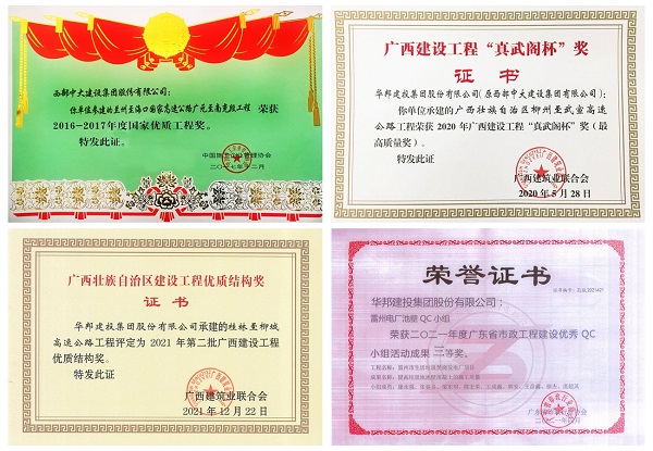 一直以来,华邦建投集团高度重视质量管理工作,注重工程施工过程中的节能降耗与生态环保要求相结合,积极推进先进的质量管理工具和方法在活动中的应用,助力品质工程创建和企业高质量发展。多个项目获得多项荣誉,其中,兰州至海口国家国家高速公路广元至南充段工程荣获2016-2017年国家优质工程奖;广西柳州至武宣高速公路获广西公路建设项目最高评分,获评广西建设工程最高质量奖——“真武阁杯”奖;广西桂林至柳城高速公路荣获“2021年广西建设工程优质结构奖”;雷州电厂项目就曾荣获2021年广东省市政工程建设优秀QC小组活动成果三等奖……
