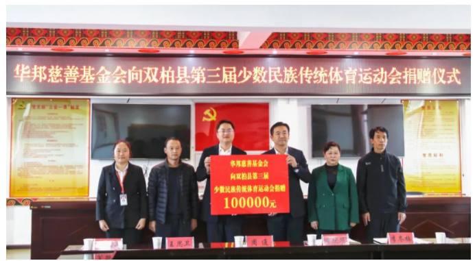 11月23日,华邦慈善基金会向云南双柏县第三届少数民族传统体育运动会捐赠10万元,支持民族运动发展,助力国家级非遗项目“陀螺运动”文化传承。双柏县副县长李跃华,县民族宗教事务局局长李冬梅,县红十字会副会长王思卫;华体会在线登录官网-华体会online(中国) 双柏县“美丽县城”项目负责人周通等出席捐赠仪式。