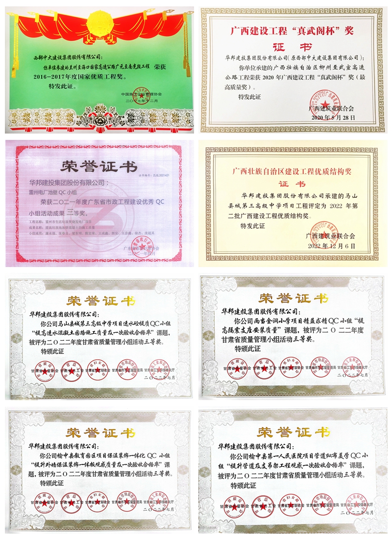 一直以来,华体会在线登录官网-华体会online(中国) 高度重视质量管理工作,注重工程施工过程中的节能降耗与生态环保要求相结合,积极推进先进的质量管理工具和方法在活动中的应用,助力品质工程创建和企业高质量发展。多个项目获得多项荣誉,其中,兰州至海口国家国家高速公路广元至南充段工程荣获2016-2017年国家优质工程奖;广西柳州至武宣高速公路获广西公路建设项目最高评分,获评广西建设工程最高质量奖——“真武阁杯”奖;雷州电厂项目荣获2021年广东省市政工程建设优秀QC小组活动成果三等奖;榆中教育园区、榆中医院、两当小学、马山中学四个项目QC小组申报的课题成果获得2022年度甘肃省质量管理小组优秀奖项;广西马山县城第三高级中学项目荣获“2022年广西建设工程优质结构奖”……