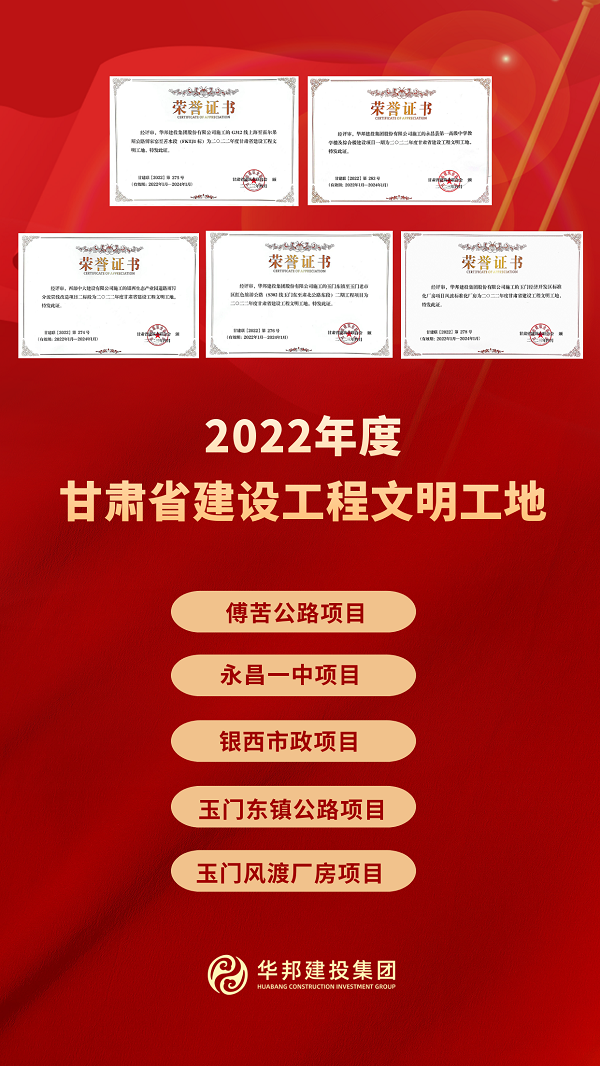 近日,在甘肃省建筑业联合会第五届会员代表大会第一次理事会暨总结表彰大会上传来喜讯,由华体会在线登录官网-华体会online(中国) 承建的甘肃傅苦公路项目、永昌一中项目、银西市政项目、玉门东镇公路项目、玉门风渡厂房项目荣获2022年度“甘肃省建设工程文明工地”称号;榆中医院项目荣获2022年度甘肃省工程施工建设项目绿色建造施工水平评价合格项目、甘肃省建筑业BIM+智慧工地示范工程,为公司赢得了良好声誉。