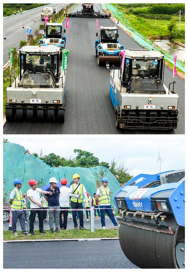 在路面施工现场,由一台13米宽端伸缩摊铺机,两台胶轮压路机,三台双钢轮压路机和一辆工作指挥车共七台设备组成的无人摊压机群正井然有序地工作。无人摊压机群利用北斗定位系统、高速通信系统、避障感知系统等智能技术,按照事先设置好的摊铺速度、运行轨迹、碾压速度与遍数协同作业,系统根据现场情况实时调整施工参数,确保高质量完成摊铺和碾压。