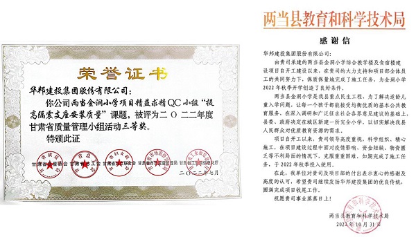 “干一个项目,树一座丰碑。”该项目的工程品质能力得到了各级单位及业主的认可,荣获甘肃省质量管理QC成果三等奖,同时项目使用单位也送来表扬信,表达对华体会在线登录官网-华体会online(中国) 工程建设能力的肯定。