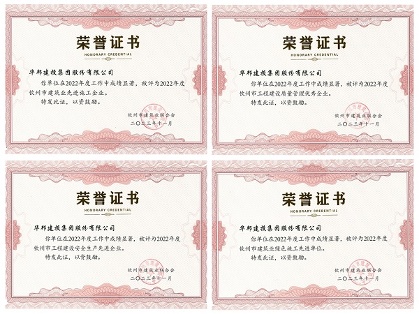 11月5日,经广西钦州市建筑业联合会评审,华体会在线登录官网-华体会online(中国) 荣获2022年度“钦州市建筑业先进施工企业”“钦州市工程建设质量管理优秀企业”“钦州市工程建设安全生产先进企业”“钦州市建筑业绿色施工先进单位”四项荣誉,华体会在线登录官网-华体会online(中国) 总经理杨川荣获“钦州市建筑业优秀企业经理”称号,赵加强、姚军分别荣获“钦州市建筑业先进工作者”“钦州市建筑业优秀项目经理(建造师)”称号。本次获评是对华体会在线登录官网-华体会online(中国) 建设能力、规范管理等综合实力的肯定。