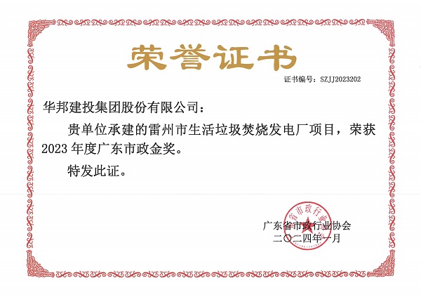 近日,经广东省市政行业协会评审,由华体会在线登录官网-华体会online(中国) 承建的雷州市生活垃圾焚烧发电厂项目(以下简称:雷州电厂)荣获