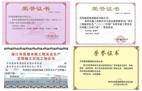 因质量上乘,雷州电厂项目荣获2023年度“广东省市政优良样板工程”称号、2022年度“广东省市政工程安全文明施工示范工地”称号、广东省市政工程建设优秀QC小组活动成果三等奖、“湛江市