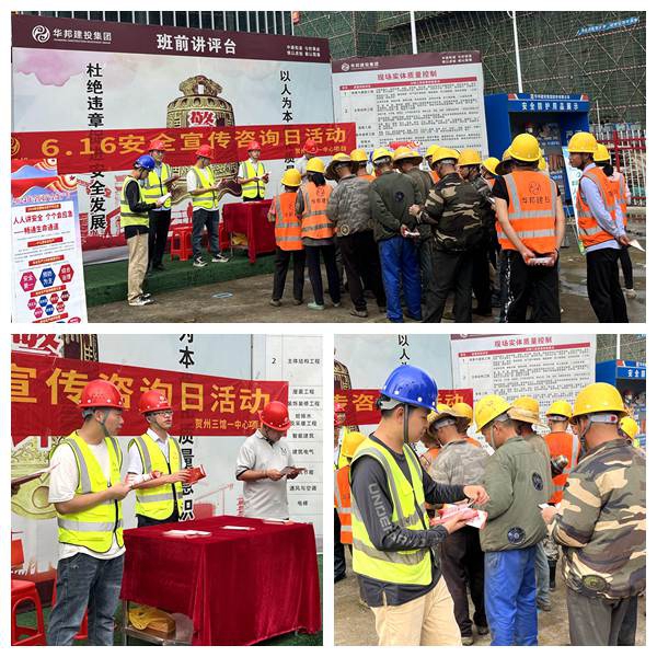 6月19日,广西贺州“三馆一中心”项目开展“6.16安全宣传咨询日”活动,以发放安全宣传手册,现场问答形式为现场管理人员及作业人员普及安全相关知识,提升从业人员疏散逃生避险意识能力,并在施工现场门卫处设置安全咨询台,安全管理部定点值班为现场作业人员提供咨询服务。安全意识大于天,风险防控在身边。