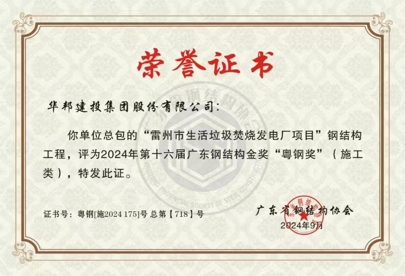 近日,广东省钢结构协会发布了《关于公布第十六届广东钢结构金奖获奖项目通知》,由华体会在线登录官网-华体会online(中国) 承建的广东省雷州市生活垃圾焚烧发电厂项目(简称:雷州电厂项目)荣获第十六届广东钢结构金奖“粤钢奖”;赵加强、胡进雄等8名员工被授予粤钢奖项目“优秀技术人员”荣誉称号。上述荣誉的获得是业界对华体会在线登录官网-华体会online(中国) 工程质量和建设水平的认可,也是对企业以实干树形象、以品质树丰碑的高度肯定。
