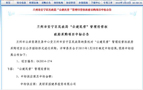 2015年1月22日,美好家园健养投资有限公司中标兰州市安宁区民政局的“公建民营”管理经营权政府采购项目。