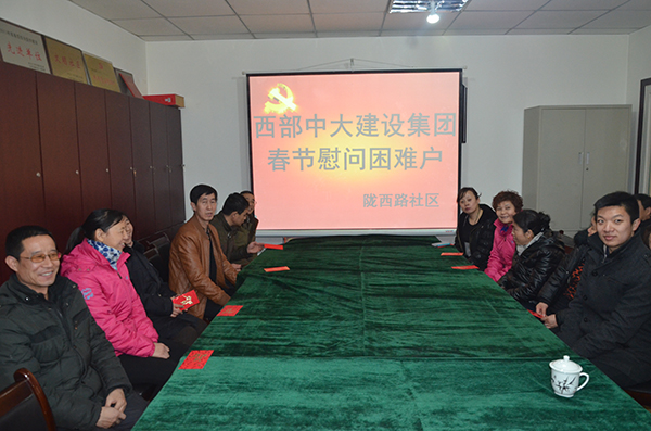 2月13日,在羊年春节来临之际,西部中大集团对辖区隶属单位----陇西路社区的20余名困难户进行春节慰问。集团工会副主席李万元带领工会成员亲切看望和慰问了困难户,并送去新春的祝福,发放了慰问金。