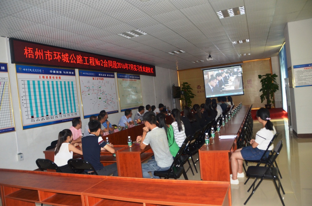上午十一点,总包部会议室里,在激昂的《华邦之歌》中正式开始了本次欢迎仪式。全部实习生作了自我介绍后,观看了西部中大建设集团股份有限公司的宣传片。通过影片让他们了解企业在短短16年中所取得的重大成就、发展历程、承建的一些大型工程项目,以及企业在做大做强的基础上承担的社会责任。