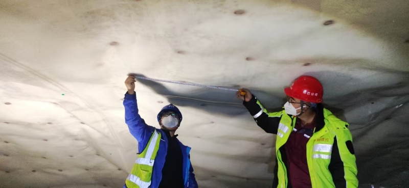 高秉福(右)在隧道内测防水报搭接长。通讯员 吴德瑞 摄