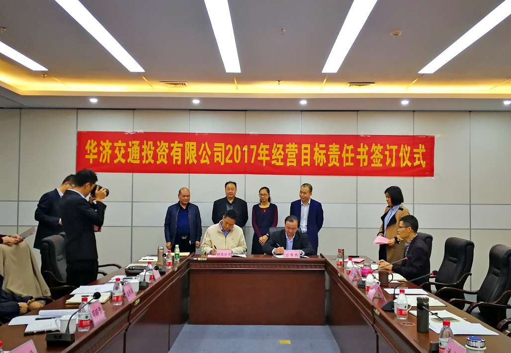 为全面完成年度经营目标和任务,进一步明确责任、加强管理、降低成本,建立良好的激励和约束机制,保持企业持续健康发展,3月22日,华济交通投资有限公司在南宁总部会议室召开工作会议并举行2017年经营目标责任书签订仪式。集团公司副总裁、华济交通交通投资有限公司总经理万章热分别与广西桂龙公司、灌平公司领导班子及投资公司职能部门负责人签订了年度经营目标责任书。