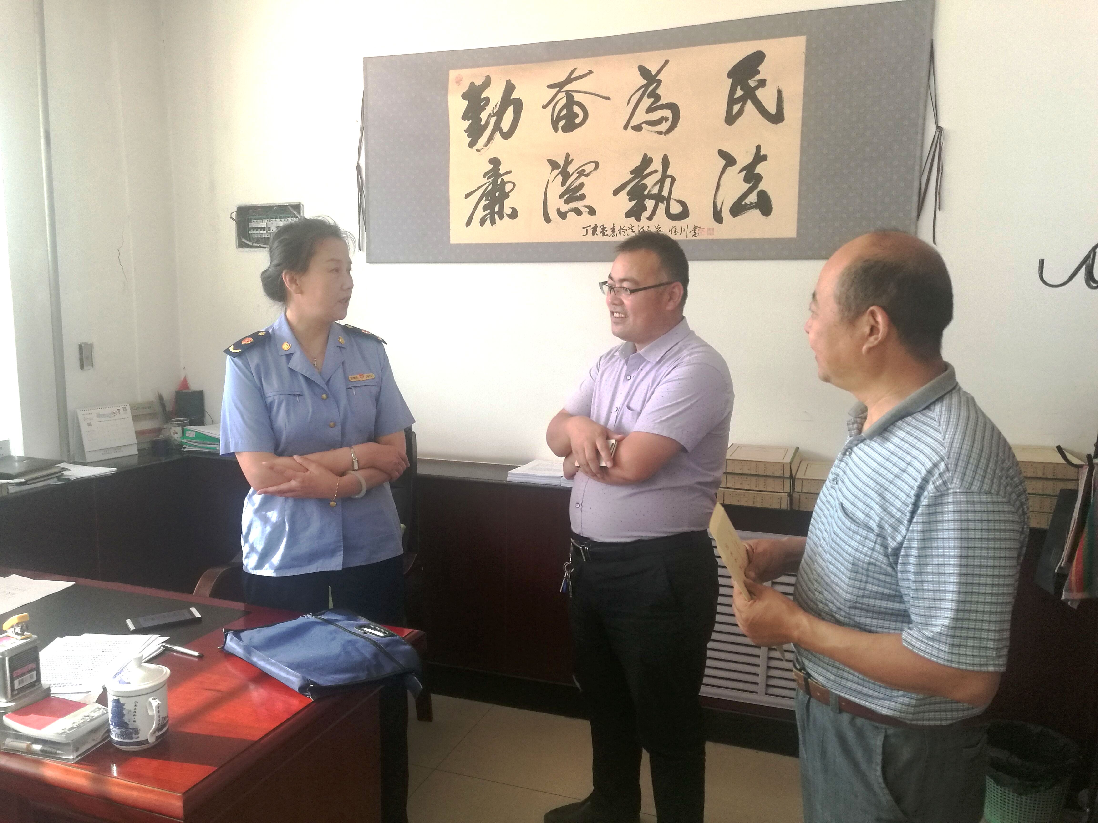 白先生向张掖路工商所副所长张静(左一)及捐助单位代表汇报受助学生学习情况