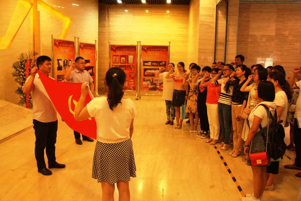 党员们列队来到庄严的纪念馆中,面对鲜红的党旗举起右手,紧握拳头庄重宣誓,重温了入党誓词。