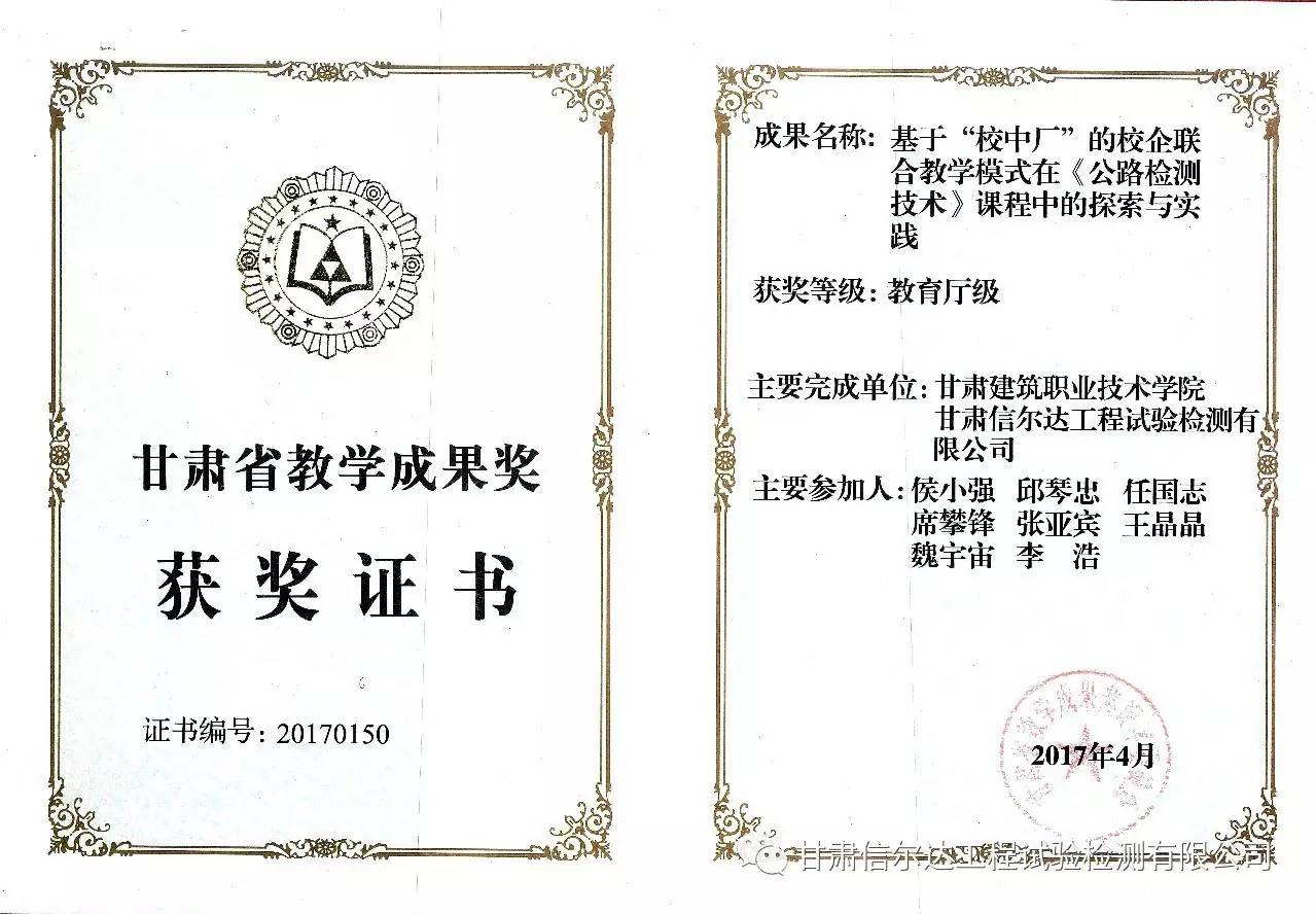 近日,西部中大建设集团股份有限公司全资子公司甘肃信尔达公司获得了由甘肃省教育厅颁发的“高等教育教学成果奖”,这是由甘肃建筑职业技术学院和甘肃信尔达工程试验检测有限公司联合完成“校企合作”的新成果:基于“校中厂”的校企联合教学模式在《公路检测技术》课程中的探索与实践。